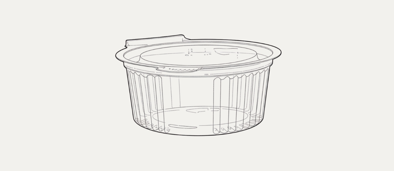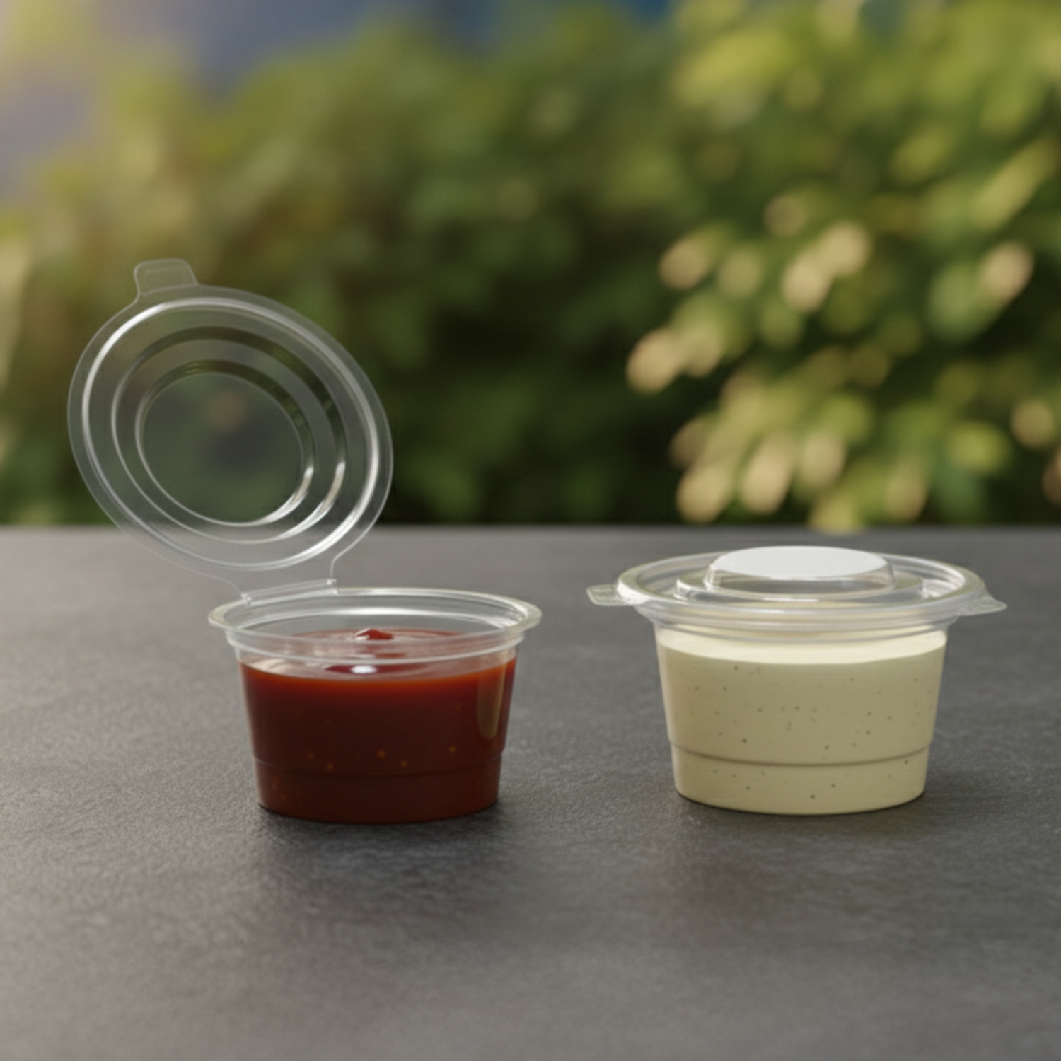 Transparent PET cups for sauces and condiments.